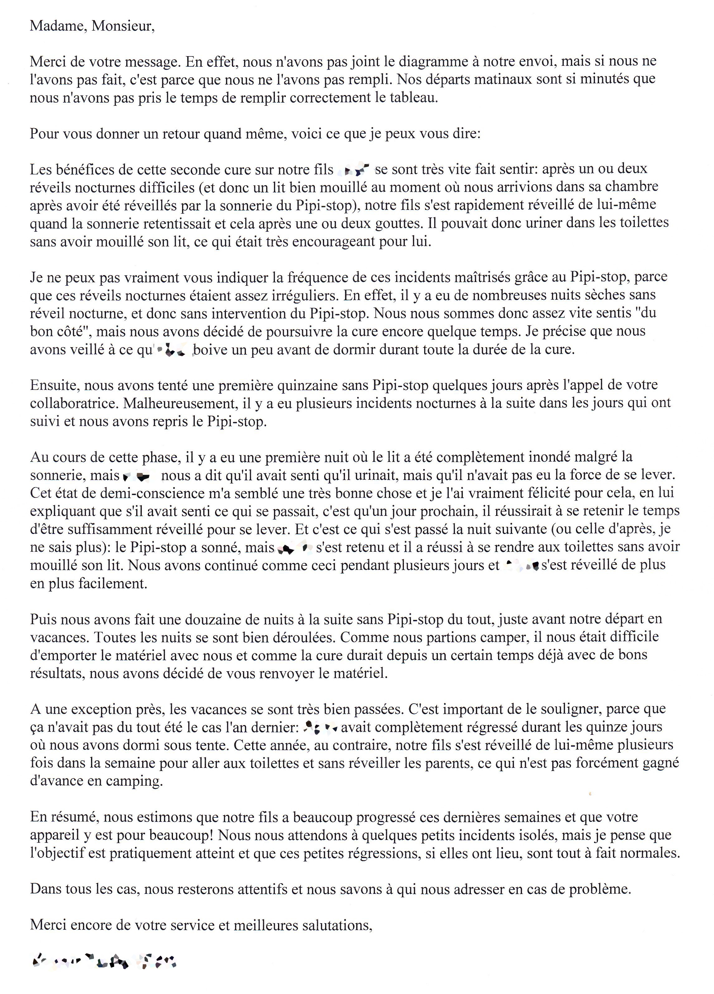 Nous avons reçu des centaines de témoignages de familles qui nous ont écrit pour nous remercier de l’aide apportée par le Pipi-Stop à leur enfant. Certaines familles nous ont autorisés à publier leur témoignage complet, alors que d’autres nous ont demandé de le publier d’une manière qui le rende anonyme. Nous avons également des témoignages de médecins, dont un en français. Vous pouvez cliquer sur les liens suivants pour accéder aux témoignages en allemand et à des anciens témoignages.